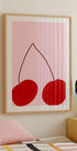 Hravé a živé minimalistické umělecké dílo se dvěma výraznými červenými třešněmi na jemném růžovém pozadí. Díky stylu pop art a čistým liniím dodává tento kousek do interiéru moderní a svěží dech, ideální pro kuchyně, jídelny a současné nástěnné umění.