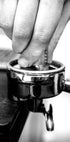 Nápadný černobílý kávový plakát s detailním záběrem baristovy ruky, jak tiskne čerstvě namletou kávu do portafiltru. Tento minimalistický monochromatický design, ideální pro milovníky kávy, kavárny a kuchyňské stěny, zachycuje umění vaření espressa.