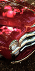 Nápadný detailní záběr na vintage Chevrolet v tmavě červené barvě s lesklými chromovanými detaily a leštěnými liniemi. Tato nostalgická fotografie auta zachycuje eleganci klasických automobilů z 50. let minulého století se slunečním světlem a okolím odrážejícím se v lesklém povrchu. Ideální pro automobilové nadšence, sběratele a milovníky retro designu.