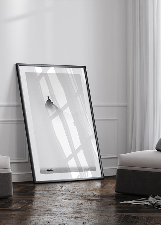 Klidná černobílá fotografie zachycující ikonickou sochu Krista Spasitele v Rio de Janeiru, majestátně stojící nad mlhou. Mlhavá atmosféra vytváří duchovní a kontemplativní atmosféru, zatímco malá veslice na vodě zdůrazňuje měřítko a hloubku scény. Nadčasové dílo, které kombinuje monumentalitu s klidem, ideální pro milovníky náboženské, architektonické a minimalistické fotografie.