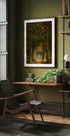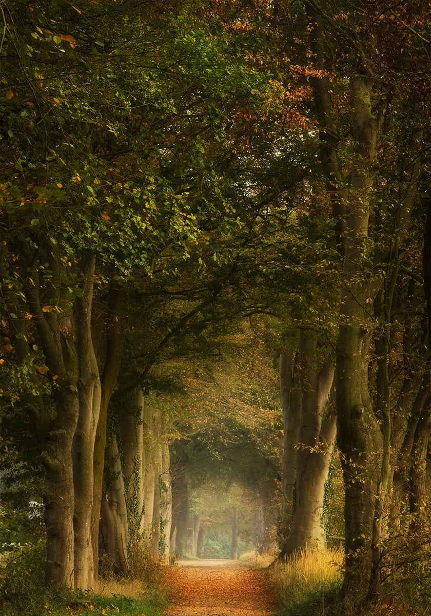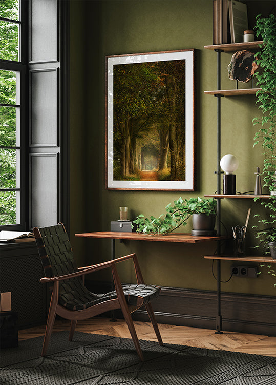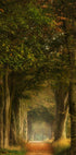 Snová lesní cesta pokrytá podzimním listím, obklopená vysokými stromy a měkkým zlatým světlem. Toto umělecké dílo zachycuje tichou krásu přírody a navozuje pocity klidu, reflexe a nadčasových cest kouzelnými lesy.