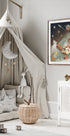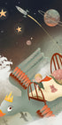 Kouzelná a rozmarná ilustrace dítěte letícího vesmírem na posteli proměněného v ptáčka s korunou. Dílo, obklopené hvězdami, planetami, raketami a snovými loděmi na noční obloze, zachycuje představy a sny z dětství.