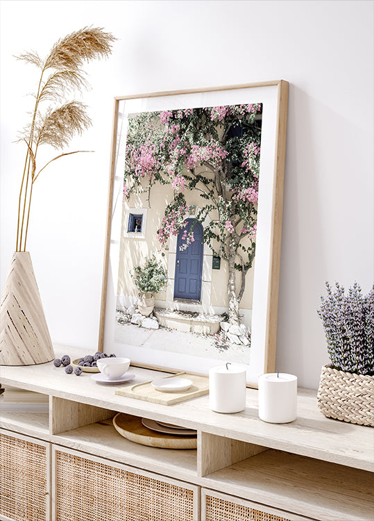 Okouzlující středomořská scenérie s zářivě modrými dveřmi obklopenými bujnou růžovou bugenvileí na sluncem zalité béžové fasádě. Tento idylický motiv zachycuje podstatu řeckých ostrovů a je ideální pro domov, který touží po teplé a klidné atmosféře.