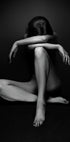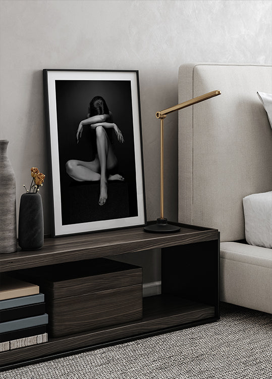 Silná umělecká černobílá fotografie sedící ženy vyjadřující syrové emoce, smyslnost a zranitelnost. S dramatickým osvětlením a monochromním výrazem dílo evokuje témata smutku, síly a melancholie a stává se poutavým figurativním nástěnným dílem.