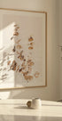 Moderní botanické umělecké dílo s větvemi eukalyptu v jiskřivých zlatých odstínech na světlém pozadí s vysokým tónem. Efekt dvojité expozice dodává hloubku a eleganci, díky čemuž je dokonalým doplňkem pro minimalistické, skandinávské a moderní interiéry.