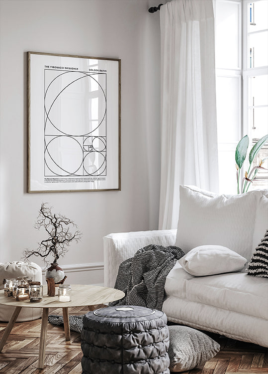 Minimalistický matematický plakát ilustrující Fibonacciho posloupnost a zlatý řez. Tento elegantní design ukazuje geometrické vztahy v přírodě, umění a architektuře. Ideální pro milovníky matematiky, studenty a moderní dekorace.
