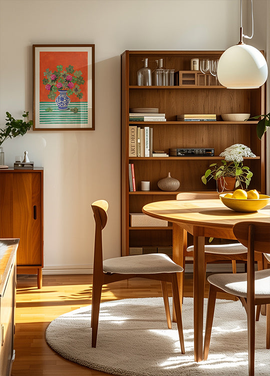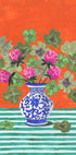 Barevné umělecké dílo zátiší s modrou porcelánovou vázou plnou růžových květů a zelených jetelů na výrazném oranžovém pozadí. Pruhovaný ubrus poskytuje hravý kontrast, díky čemuž je tento kousek živým dekorativním výrazem. Ideální pro milovníky botanického i moderního umění.