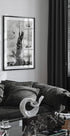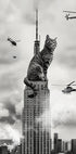 Surrealistické a vtipné umělecké dílo zobrazující obří kočku na vrcholu Empire State Building, obklopenou helikoptérami v parodii inspirované King Kongem. Tato černobílá panoráma města je ideální pro milovníky koček a fanoušky zábavné městské dekorace.