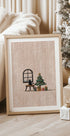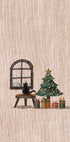 Okouzlující umělecké dílo inspirované výšivkou s černou kočkou sedící u okna a hledící na sníh. Ozdobený vánoční stromeček s dárky vytváří pohodu a vánoční atmosféru, ideální jako vánoční dekorace do domácnosti.
