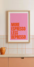Jasný, odvážný a vtipný – tento moderní typografický plakát obsahuje hravou frázi „More Espresso Méně Depresso“ v tučném oranžovém textu na růžovém pozadí. Dokonalá kombinace motivace a zábavy, ideální do kuchyní, kanceláří nebo kaváren. Ideální pro milovníky kávy se smyslem pro humor.