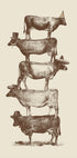 Vtipné a surrealistické umělecké dílo ve vintage stylu zobrazující hromadu krav, z nichž každá má jiné klobouky. Hravá ilustrace, která kombinuje venkovskou nostalgii s ironickým humorem – ideální pro výzdobu farmy nebo eklektické umělecké sbírky.