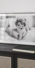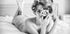 Stylový černobílý plakát, který zachycuje retro inspirovaný portrét ženy s vintage kučeravými vlasy, která elegantně leží na posteli a drží vintage fotoaparát. Se směsí smyslnosti, nostalgie a uměleckého vyjádření fotografie oslavuje ženskou přitažlivost a nadčasový půvab.
