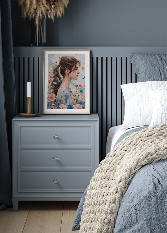 Zasněná akvarelová kresba klidné mladé ženy obklopené rozkvetlými květinami v pastelových barvách. Jemní motýli a vznášející se listy evokují pocit klidu a rozjímání, ideální pro vytvoření harmonické a inspirativní atmosféry.