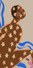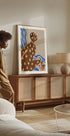Živé, figurativní umělecké dílo zobrazující lidskou podobu pokrytou rozkvetlými sedmikráskami. Zemité tóny postavy kontrastují s jasně modrými liniemi, které dodávají pohyb a energii. Jedinečné a expresivní dílo inspirované botanikou, které kombinuje květiny a lidský výraz, ideální pro moderní interiéry.