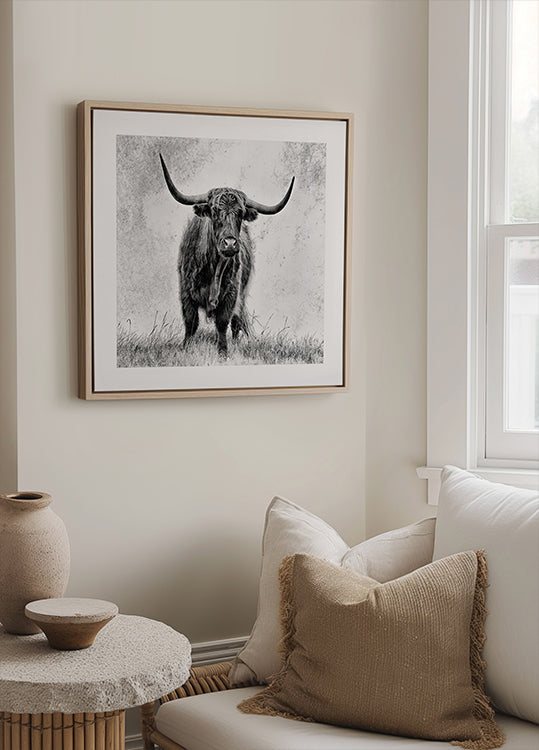 Ikonický skotský skot ze skotské vysočiny se vynořuje v dramatické černé a bílé, s mocnými rohy a hlubokým pohledem, zachycený ve vysokém osvětlení, které zdůrazňuje strukturu a klid. La force od Stéphana Pecqueuxe spojuje syrovou sílu a venkovskou poezii – nadčasový motiv, který do prostoru vnáší přítomnost přírody a severské jednoduchosti.