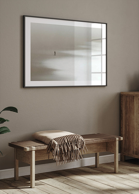 Osamělá osoba stojí nehybně na mlhavé pláži obklopená jemnými stíny. Snové a minimalistické dílo, které zprostředkovává klid, zamyšlení a sílu ticha.