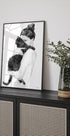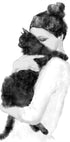 Jemná černobílá akvarelová ilustrace ženy objímající svou kočku. Toto citlivé umělecké dílo vyjadřuje lásku, intimitu a nadčasové pouto mezi člověkem a mazlíčkem, ideální pro minimalistické interiéry a interiéry inspirované zvířaty.
