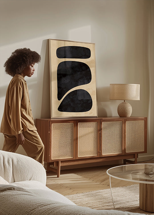 Elegantní abstraktní kresba se třemi nápadnými černými tvary naskládanými na teplém béžovém pozadí. Minimalistická kompozice a texturovaný povrch dodávají moderní a sofistikovaný nádech — ideální pro stěny galerií, obývacích pokojů nebo interiérů inspirovaných skandinávskými interiéry.