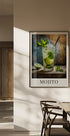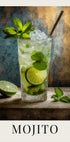 Živé umělecké dílo zobrazující klasický mojito koktejl s lístky máty, klínky limetky a brčky ve sklenici naplněné ledem. Texturované pozadí zdůrazňuje svěží a osvěžující atmosféru, ideální pro fanoušky pití a koktejlového umění.