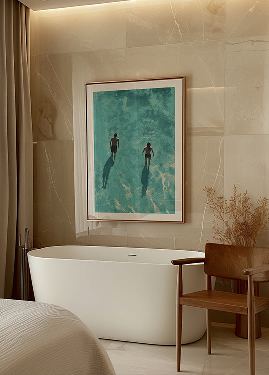 Klidný a dojemný motiv páru stojícího v mělké, čisté tyrkysové vodě. Jejich stíny na mořském dně dodávají hloubku a pocit sounáležitosti. Toto dílo je ideální pro vytvoření romantické letní atmosféry ve vašem domě nebo na chatě.