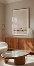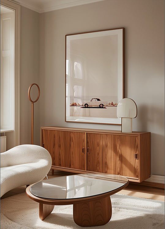 Minimalistická a nostalgická fotografie historického kabrioletu zaparkovaného u moře. Toto umělecké dílo zachycuje podstatu kalifornského pobřeží a evokuje vzpomínky na roadtripy, letní dny a nadčasové retro kouzlo.