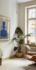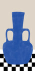 Odvážné moderní umělecké dílo s tmavě modrou vázou na minimalistickém béžovém pozadí a nápadnou černo-bílou kostkovanou podlahou. Toto geometrické a současné zátiší, které kombinuje abstrakci s estetikou interiérového designu, vytváří stylový vizuální ústřední bod.
