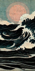 Dramatické vlnové dílo inspirované Japonskem s texturovaným vintage stylem. The powerful ocean waves rise under a subdued sun, which unites traditional art with modern Japandi aesthetics. Ideální pro milovníky mořských scenérií a tradičních maleb z vln.