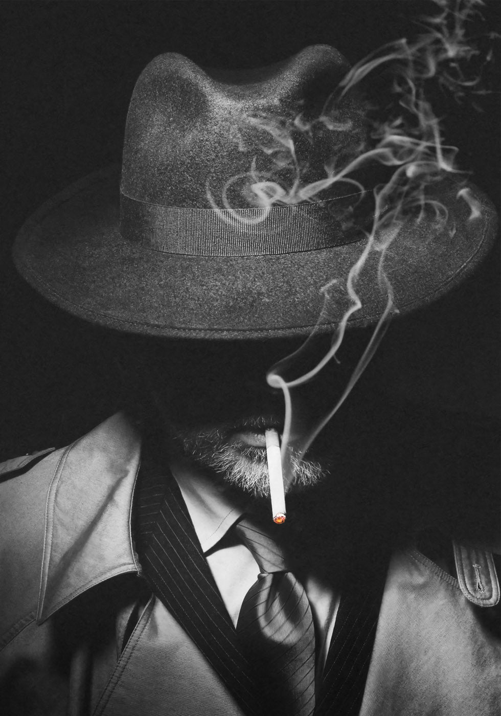 Dramatický černobílý portrét tajemného muže v klobouku fedora a trenčkotu vydechujícího cigaretový kouř. Hluboké osvětlení a stíny vytvářejí klasickou noir atmosféru připomínající staré hollywoodské detektivky. Ideální pro milovníky filmu noir, historických kriminálních příběhů a nadčasových filmových motivů.