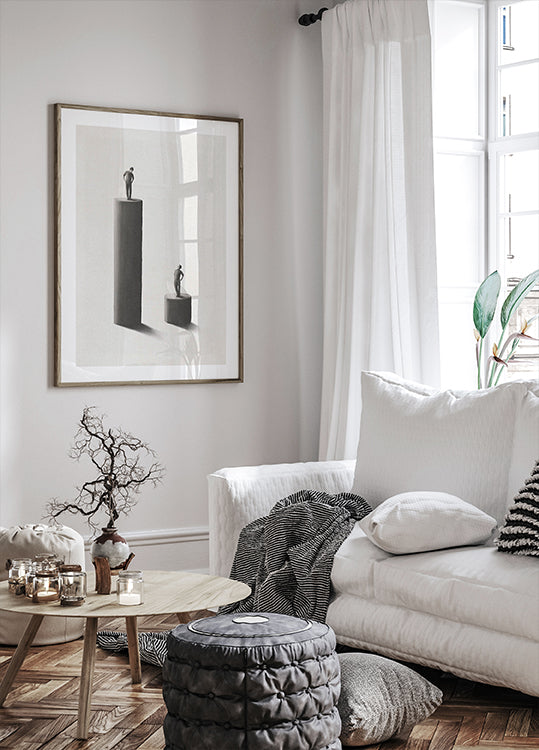 Surrealistické umělecké dílo podněcující k zamyšlení zobrazující dvě malé lidské postavy stojící na oddělených válcových podstavcích v různých výškách. Jedna postava shlíží dolů z vyšší plošiny, zatímco druhá vzhůru, a ilustruje tak témata nerovnosti, privilegií a společenské hierarchie. Minimalistický design v odstínech šedi umocňuje symbolický výraz díla a činí z něj silný vizuální komentář k postavení, ambicím a perspektivě. Ideální pro moderní, konceptuální a minimalistické umělecké sbírky.