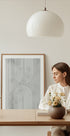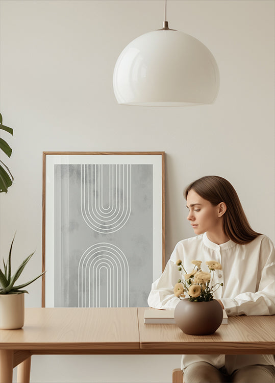 Minimalistický abstraktní plakát s bílými zakřivenými čarami zrcadlenými v symetrii na měkkém šedém texturovaném pozadí. Umělecké dílo, inspirované moderní estetikou poloviny století a monochromatickou paletou, kombinuje rovnováhu a jednoduchost, ideální pro současné interiéry a prostory inspirované Skandinávií.