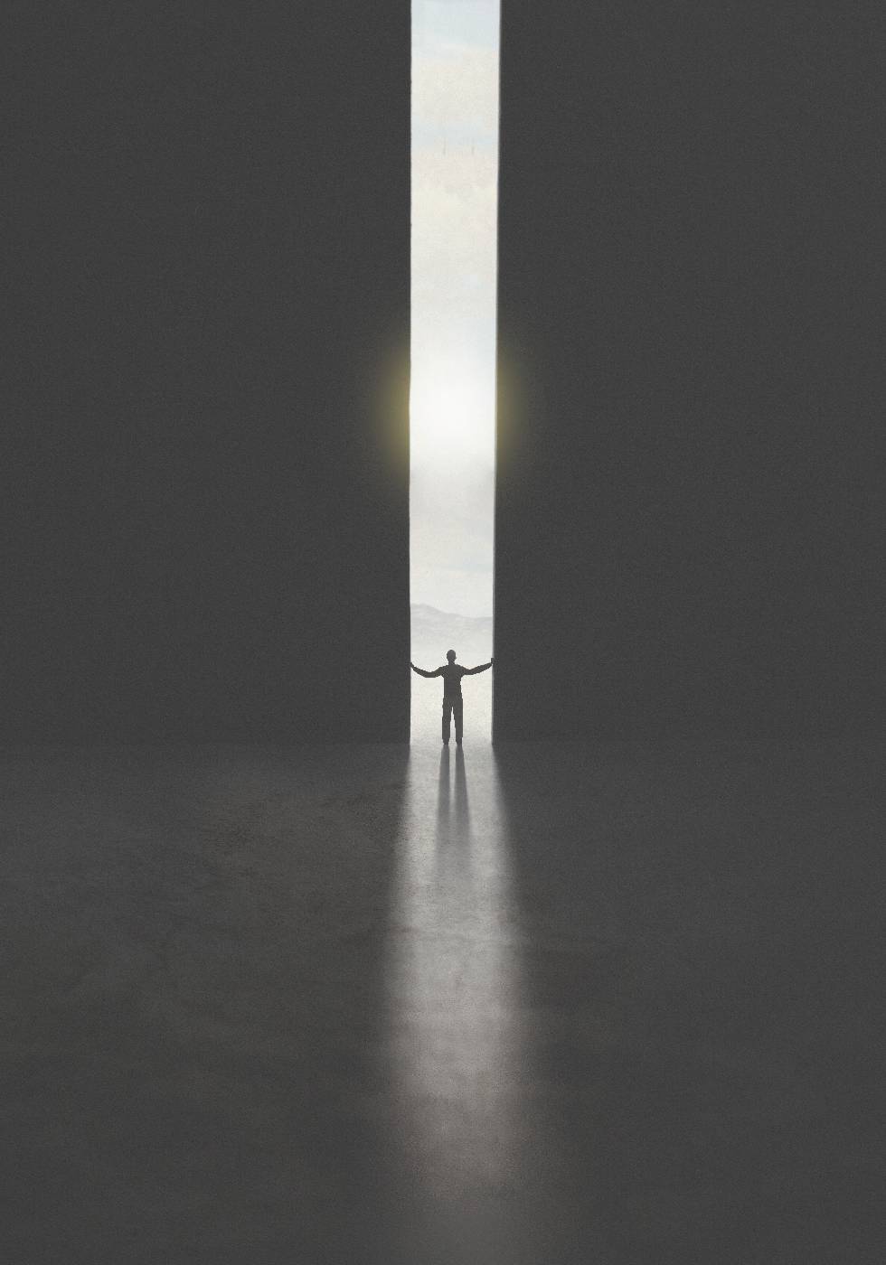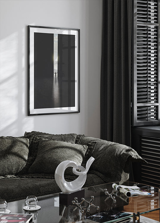Plakát Out of Darkness* je silně surrealistické umělecké dílo, které symbolizuje sílu, naději a nové začátky. Osamělý člověk stojí před gigantickými dveřmi, odsune temnotu stranou a vpustí dovnitř světlo. Tento minimalistický, ale přesto silný obraz představuje překonávání překážek, osobní rozvoj a krok ke světlejší budoucnosti. Ideální do domácností, kanceláří, terapeutických místností nebo jako inspirativní dárek.