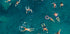 Barevný letecký pohled na lidi, kteří plavou a vznášejí se v křišťálově čisté tyrkysové vodě. Tato živá letní scéna zachycuje radost z volného času, svobody a osvěžení pod sluncem. Ideální pro navození prázdninové nálady a pobřežní relaxace.