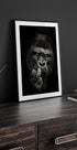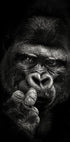Nápadný černobílý portrét gorily zachycený v okamžiku syrové intenzity. Hluboké stíny a jemné detaily zdůrazňují sílu a přemýšlivý pohled zvířete, což dává uměleckému dílu dramatický, téměř lidský výraz. Perfektní pro moderní interiéry a stěny galerií, které hledají silné, výrazné a výrazné kusy.
