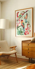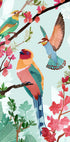 Živá a tropická ilustrace barevných ptáků sedících a létajících mezi bujnými větvemi a květinami. S výraznými odstíny zelené, červené a modré umělecké dílo zachycuje radost a vitalitu letní divoké přírody. Ideální pro přidání svěžího a exotického nádechu do každé místnosti.
