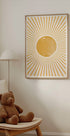 Toto umělecké dílo se vyznačuje minimalistickým designem sunburst s centrálním kruhem, který vyzařuje rovné linie a vytváří odvážný geometrický vzor. Použití teplých barev dodává retro, vintage pocit, ideální pro moderní dekor a umělecký výraz.
