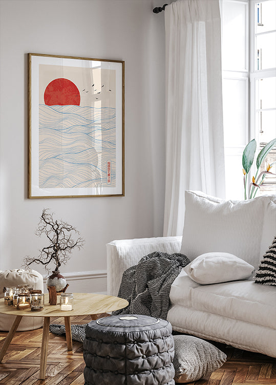Plakát *Rudé slunce* je klidná a elegantní kompozice inspirovaná *japonským minimalismem*. S výrazným rudým sluncem nad jemně se valícími modrými vlnami oceánu toto umělecké dílo odráží *harmonii mezi přírodou a jednoduchostí*. Jemné béžové pozadí dodává tradiční nádech, takže je ideální do moderních, zenových nebo skandinávských interiérů. Perfektní dárek pro ty, kteří milují *japonské umění, minimalismus a pobřežní krajinu*.