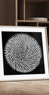 hypnóza od Giorgia Toniola vtahuje oko do monochromatického víru soustředných prstenců, které pulzují ve Fibonacciho rytmu a vytvářejí hypnotickou sférickou iluzi. Pevná symetrie a ostrý kontrast spojují klid a napětí – minimalistický plakát s prohlášením, který proměňuje zeď v meditativní ohnisko.