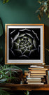 Hypnotický detailní záběr růžice Sempervivum, listy rozvíjející se v dokonalé symetrii a sytě zelené odstíny na tmavém, tichém pozadí. Geometrický řád se setkává s organickou poezií a vytváří klidný, grafický efekt. Fotografie Victora Mozquedy, ideální do moderních prostor. Kontrast zdůrazňuje architekturu a klid závodu.