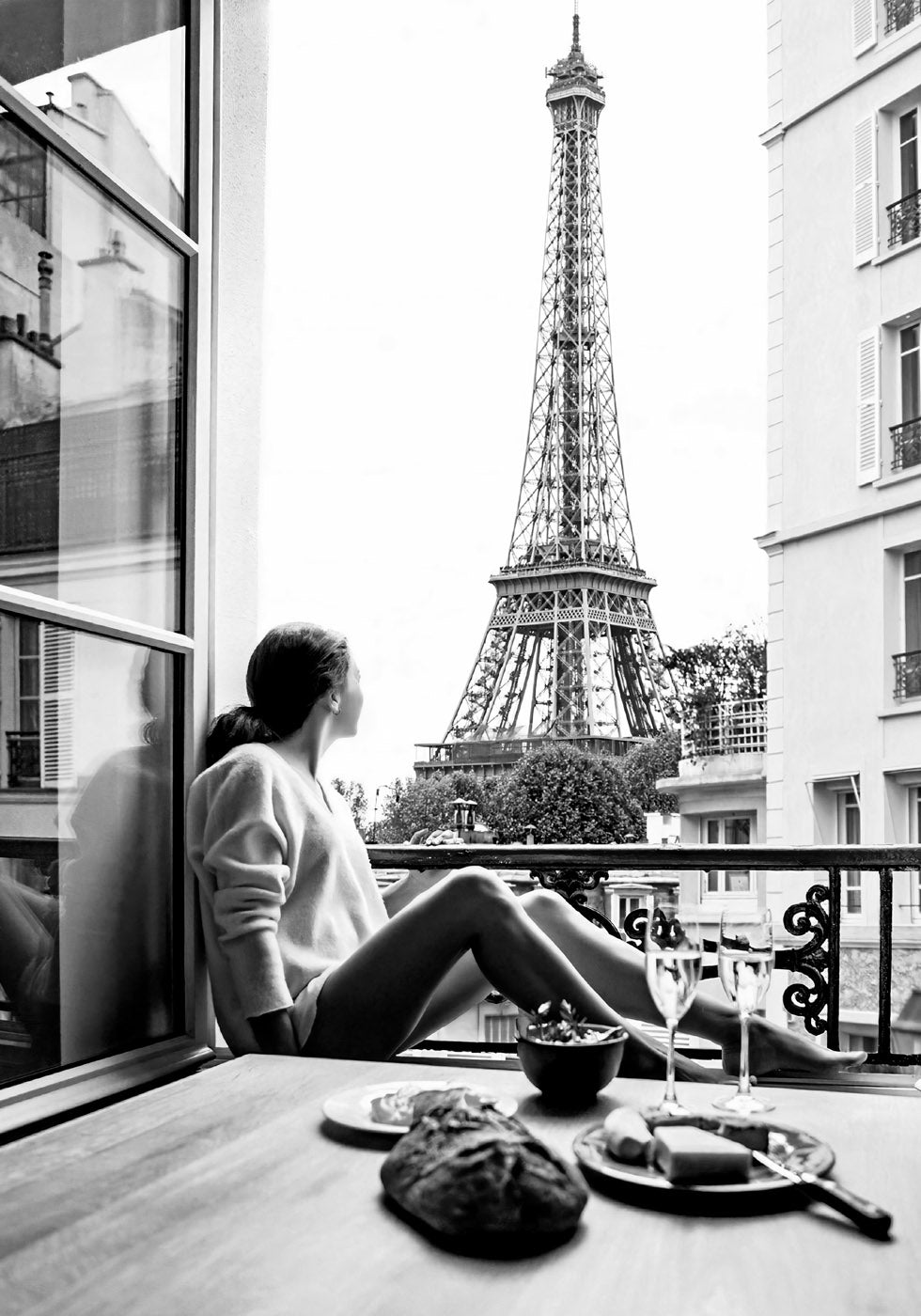 Stylová černobílá fotografie zachycující klidné pařížské ráno. Žena relaxuje na balkoně s výhledem na Eiffelovu věž, zatímco se na stole podává lahodná francouzská snídaně s čerstvým chlebem, sýrem a vínem. Tato elegantní a romantická scéna zachycuje pařížský životní styl a je ideální pro ty, kteří milují cestování, romantiku a nadčasovou eleganci.