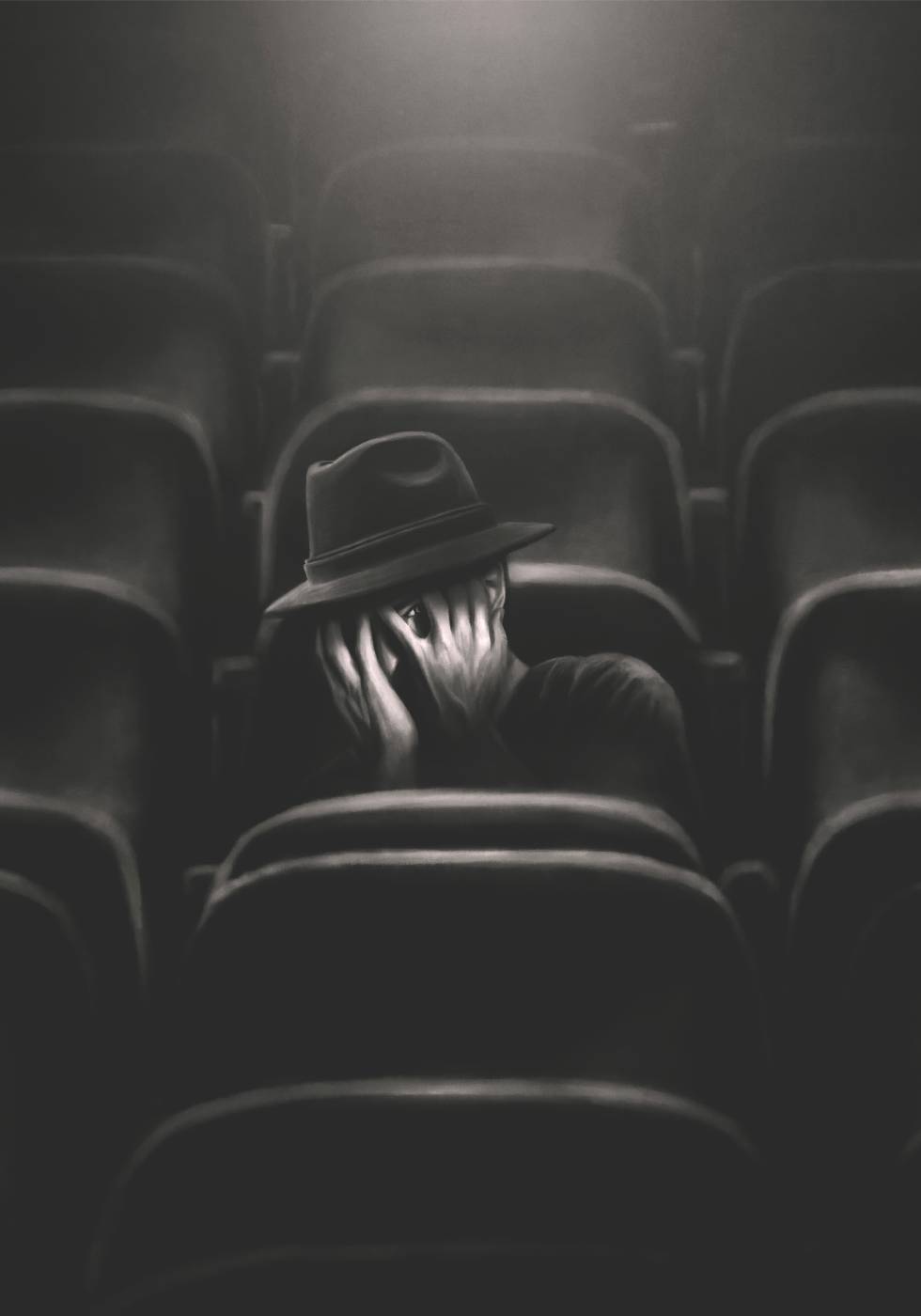 Intenzivní černobílé dílo zobrazující muže samotného v prázdném kině s hlavou zabořenou v dlaních a jedním okem vykukujícím ven. Symbol úzkosti, sledování a existenciální osamělosti.
