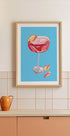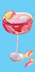 Toto živé umělecké dílo zobrazuje stylizovaný koktejl ve sklenici zdobený růžovými a žlutými okvětními lístky na jasně modrém pozadí. Plynulé tahy štětcem obrazu vytvářejí moderní a energický výraz, ideální pro témata související s nápoji nebo současným uměním.