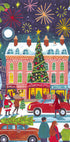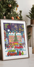 Caroline Bonne Müller zachycuje vánoční atmosféru velkoměsta: zasněžená ulice září výlohami a girlandami, přes silnici přecházejí lidé s balíčky a kolem projíždí auto s vánočním stromečkem. Nad střechami se třpytí hvězdy a dotek ohňostroje naznačuje, že Nový rok je za rohem. Poetická zimní scéna, ideální pro útulné obývací pokoje.