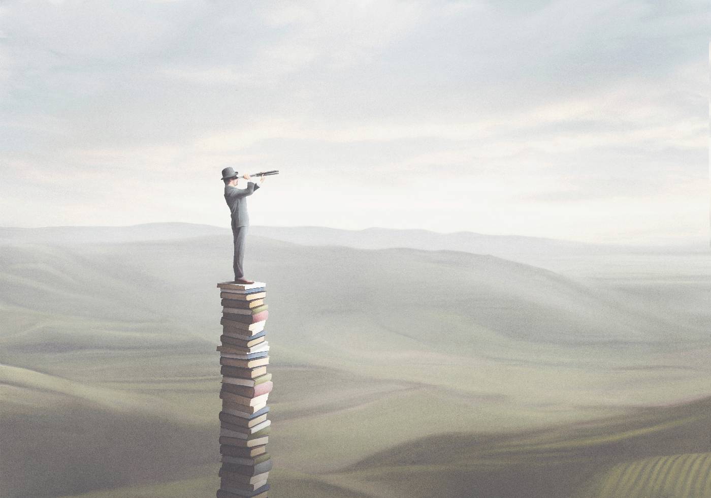 Plakát The Tower of Books* je inspirativní surrealistická ilustrace, která symbolizuje znalosti, učení a nové perspektivy. Muž v obleku stojí na vysokém stohu knih a dívá se dalekohledem – krásná metafora toho, jak vzdělání a moudrost otevírají obzory. Ideální pro knihovny, kanceláře, učebny nebo pro ty, kteří milují osobní rozvoj a intelektuální průzkum.