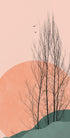 Uklidňující minimalistická krajina, Západ slunce Serenity zachycuje tichou krásu přírody s nápadnou jednoduchostí. Štíhlé, jemné siluety stromů se tyčí proti velkému, teplému oranžovému slunci, orámované měkkými, zvlněnými zelenými kopci a bledou broskvovou oblohou. Nad nimi se vznášejí dva malí ptáčci, kteří dodávají pocit míru a otevřenosti. Vyvážená kompozice a tlumená barevná paleta činí tento kousek perfektním pro moderní, skandinávské nebo japonsky inspirované interiéry a vytváří klidné ústřední místo v každé místnosti.