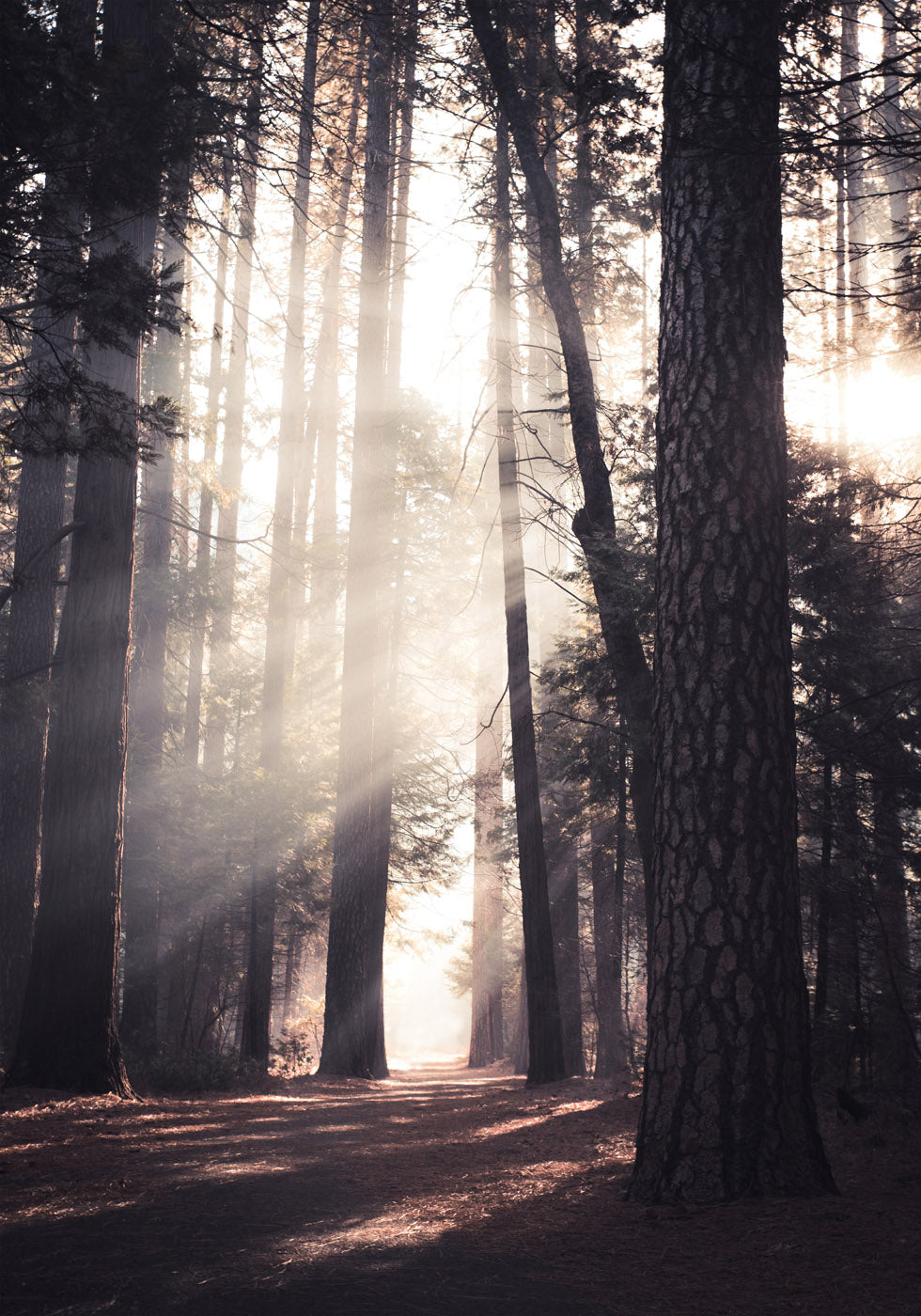 Atmosférická lesní scéna z Yosemitského údolí, kde ranní slunce filtruje vysoké stromy a kreslí zlaté paprsky ve světelné mlze. Hluboké stíny a vrstvy za vrstvami zelených odstínů vytvářejí klid a hloubku, zatímco tichá lesní cesta vybízí k rozjímání, dobrodružství a hlubokým nádechům. Katedrála přírody v časném světle.