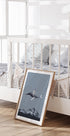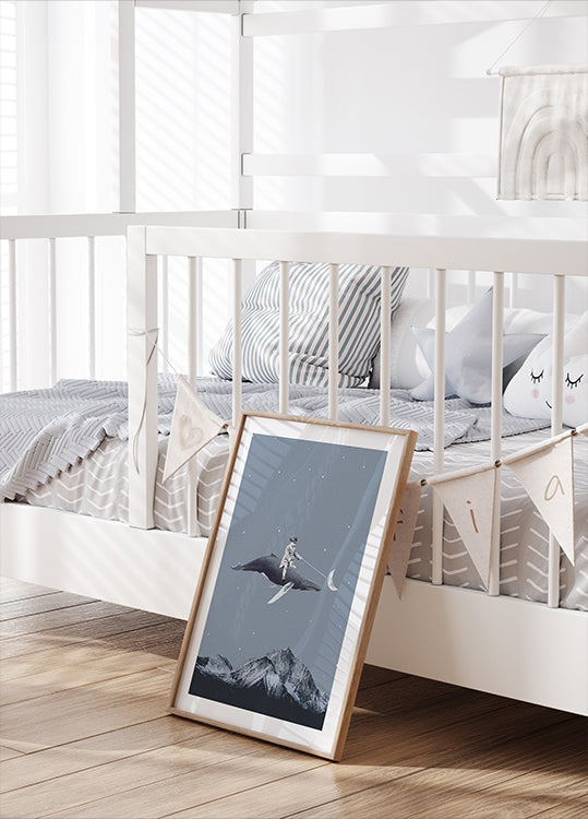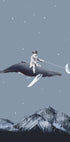 Surrealistické a imaginativní umělecké dílo zobrazující chlapce, jak jezdí na velrybě hvězdnou noční oblohou a ovládá srpek měsíce pomocí tyče. Tato snová kompozice nad zasněženými horami zachycuje dětský zázrak, představivost a neomezenou představivost – ideální pro dětské pokoje a hravé interiéry.