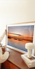 Úžasná fotografie západu slunce nad stojatou vodou s dlouhou expozicí, s hedvábně hladkým povrchem zářícím v odstínech oranžové a růžové. Hejno ptáků v elegantním letu dotváří scénu a dodává této klidné mořské krajině pohyb a hloubku. Ideální pro milovníky klidné, poetické krajiny.