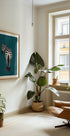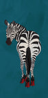 Toto moderní umělecké dílo zobrazuje zebru stojící na modrozeleném pozadí, pozoruhodnou svými stylovými černými botami na vysokém podpatku. Surrealistická kompozice mísí divokou přírodu s módou a vytváří odvážný a hravý výraz, který zpochybňuje tradiční umění zvířat.