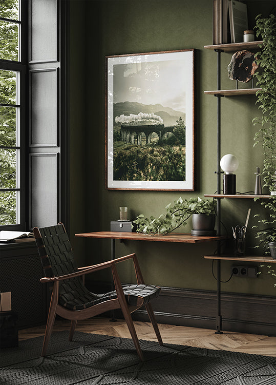 Úžasná fotografie viaduktu Glenfinnan, kde staromódní parní vlak jezdí po historickém mostě ve Skotské vysočině. Mlžná krajina a dramatické světlo vytvářejí magickou a nostalgickou atmosféru. Ideální pro cestovatele, milovníky vlaků a ty, kteří ocení ikonické přírodní scenérie.
