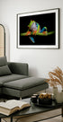Nápadný detailní záběr na rosničku červenookou (Agalychnis callidryas) posazenou na zeleném stonku na temném černém pozadí. Živé zelené tělo, oranžové nohy a jasně červené oči vytvářejí fantastickou kompozici plnou barev a tajemství. Tento makro potisk přírody je ideální pro milovníky zvířat, přírody nebo ty, kteří chtějí odvážné a exotické nástěnné umění